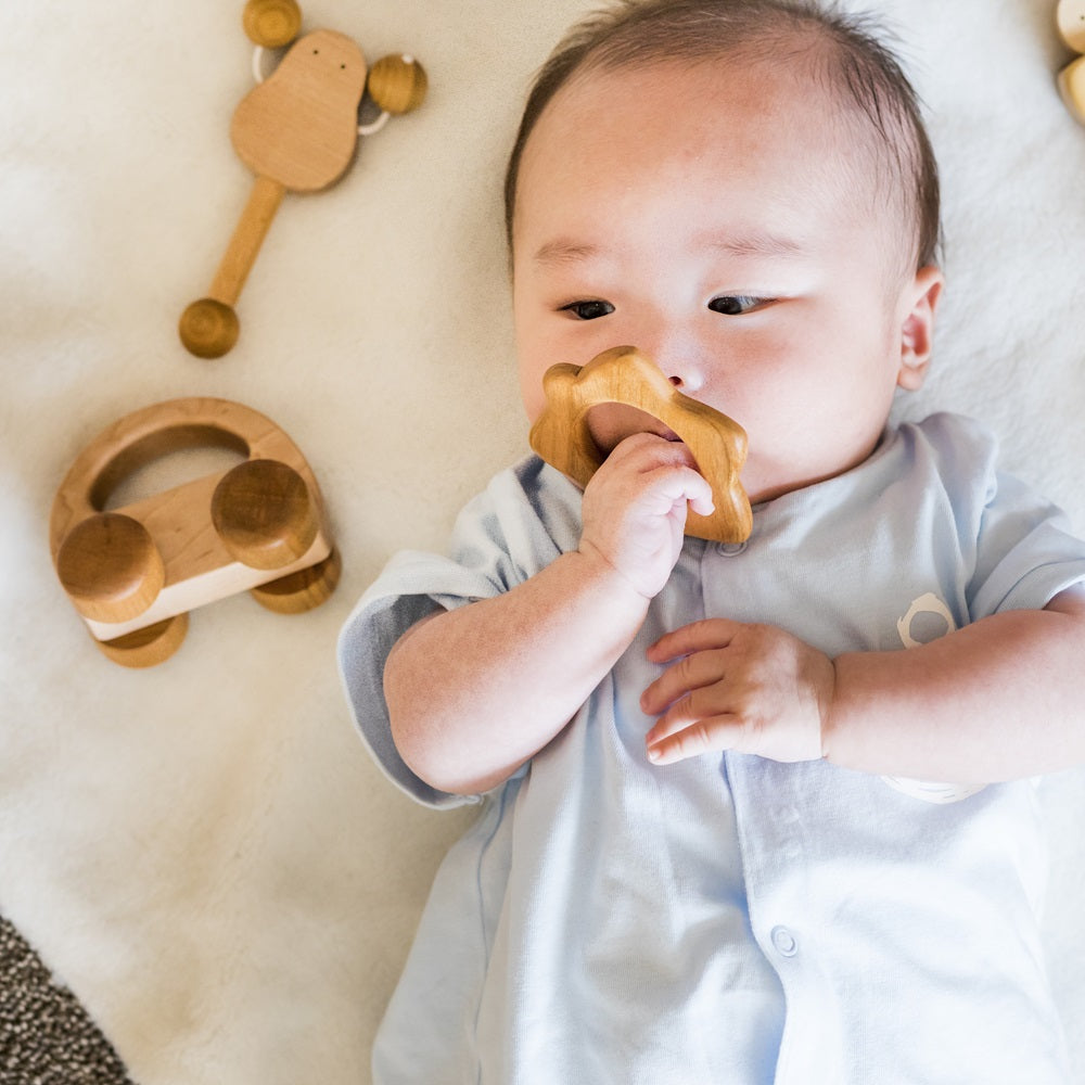 あかちゃんにとっておもちゃは「なめて、噛んで」体全体で遊び確かめています。人工的でカラフルなおもちゃではなく自然素材ならとても安心です。