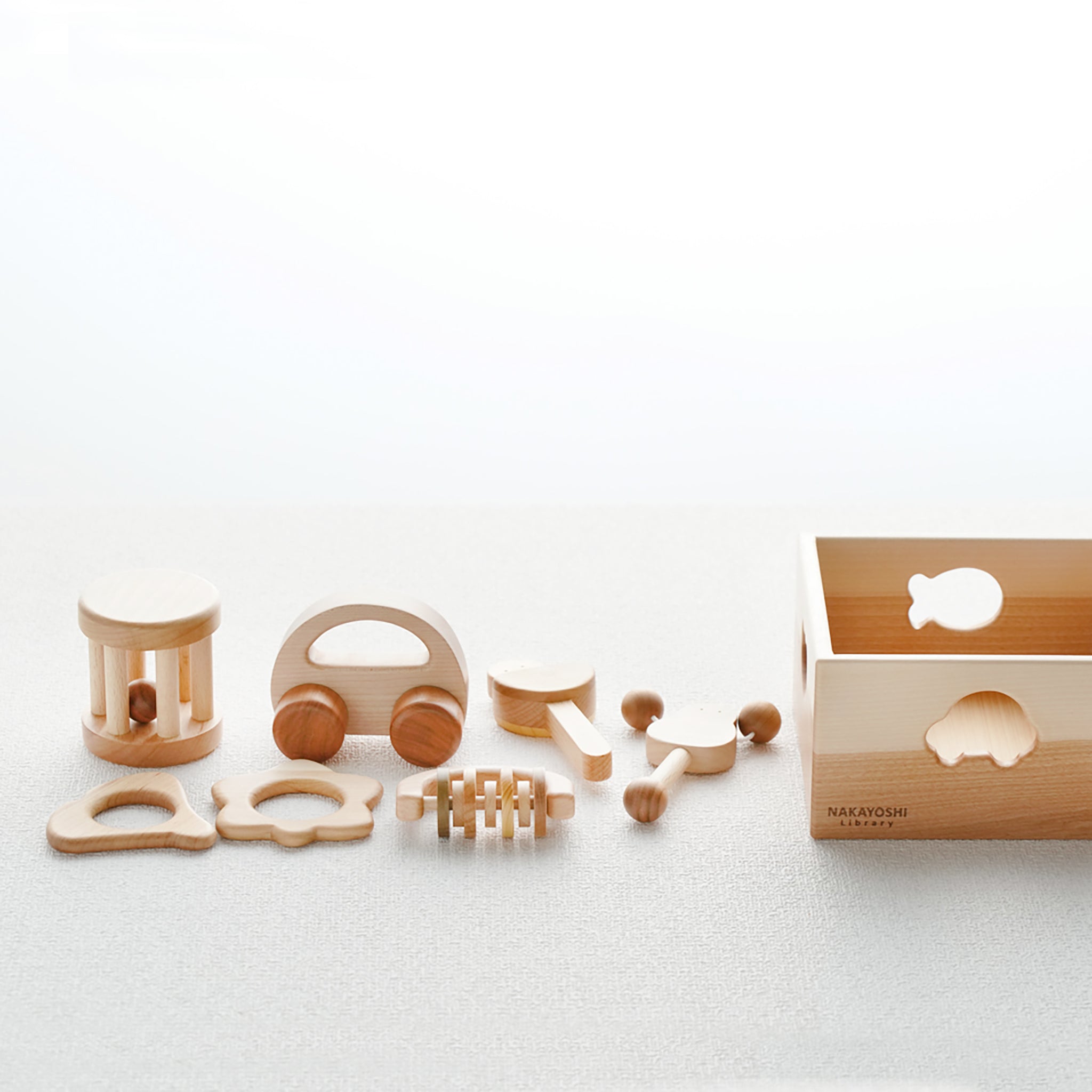 赤ちゃんにぴったりの6種類の木のおもちゃが入ったセットです。