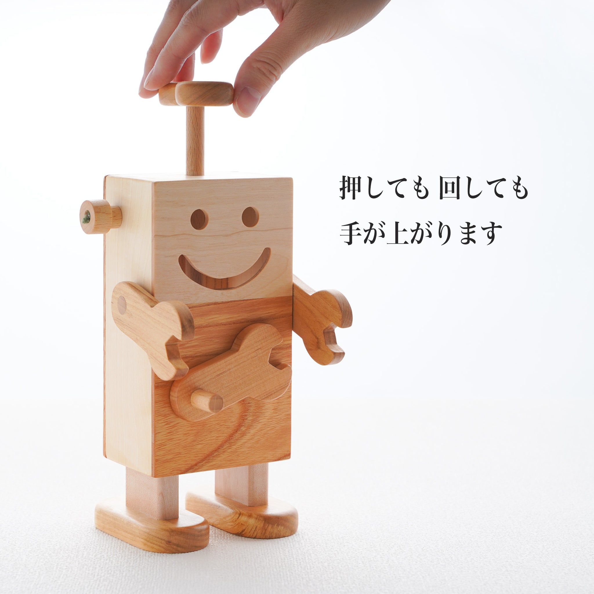 カチカチ回るお腹のスパナ。連れて歩ける可愛い木製ロボット君