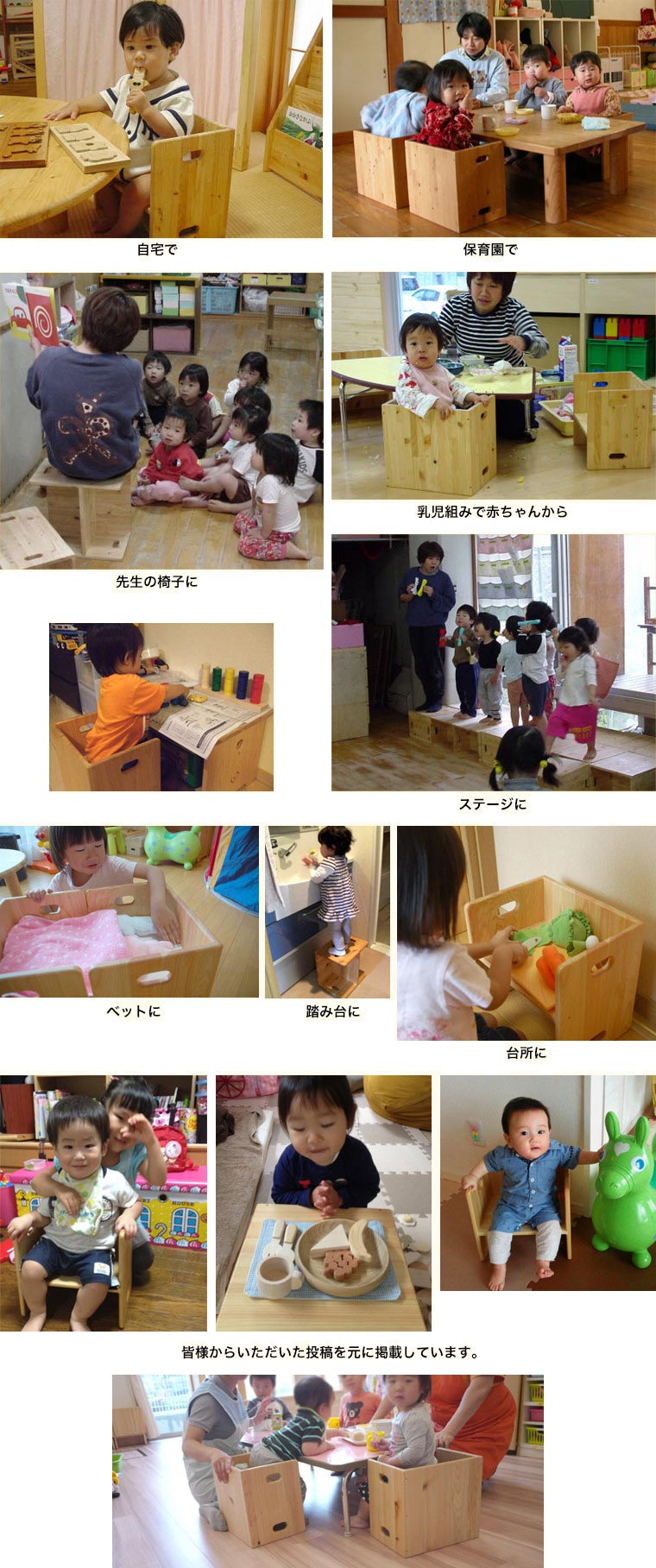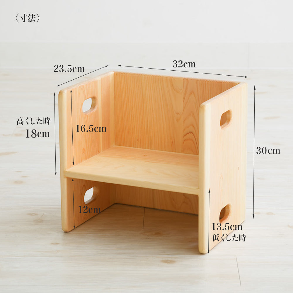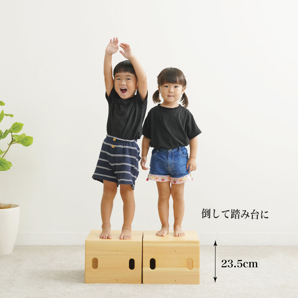 反対にして座面の高さが変わります。歩き始めの赤ちゃんから3歳児まで幅広く使うことができます。3歳を過ぎると椅子は使わなくなる代わりに、遊び道具として、お店になったり乗り物になったりと、ごっこ遊びに大活躍いたします。横にしてお母さんの椅子に変身。お母様の踏み台や椅子に使ってもびくともしない頑丈なつくりになっています。