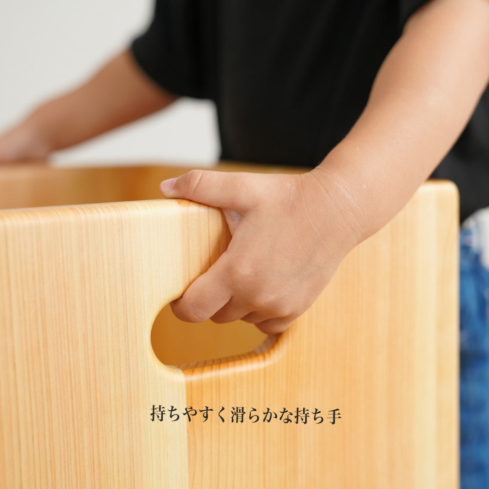 たおしてテーブルに変身。ままごと遊びや、お絵かきにも大活躍します。子供たちの遊びにはちょこっとテーブルになることで遊びを楽しくしてくれます。洗面台に届かない子供たちには踏み台としても活躍します。持ち手は上下にも付いていますので、どこからでも持つことができます。